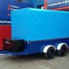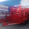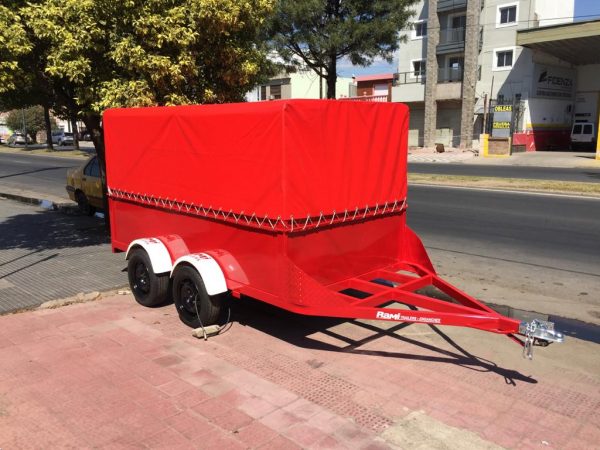 Trailer tipo Albañil, de chapa lisa con plegado estilo bandeja. Reforzado para trabajos pesados. Fabricado en chapas de grueso espesor y barandas c/doble caño para atar. Jaula desmontable realizada en caño redondo curvado con matrices especificas y cubierta de lona Pampero con ojales perimetrales para atar con soga.